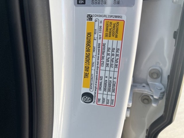 Advanced Security Package (Glass Breakage Sensor, Self-Powered Horn Theft-Deterrent Alarm System, Vehicle Inclination Sensor, and Vehicle Interior Movement Sensor), Advanced Trailering Package (Blind Zone Steering Assist with Trailering, Hitch View with Pan/Zoom Image Adjustment, and Smart Trailer Integration Indicator), High Country Deluxe (Air Ride Adaptive Suspension, Dual-Pane Power Panoramic Sunroof, and Power-Retractable Assist Steps), License Plate Front Mounting Package, Max Trailering Package (2-Speed Active Electronic AutoTrac Transfer Case, Extra Capacity Cooling System, Hill Descent Control, and Integrated Trailer Brake Controller), Preferred Equipment Group 3LZ (15 Diagonal Multi-Color Head-Up Display, 3rd Row 60/40 Power-Folding Split-Bench, 4-Way Power Driver Lumbar Seat Adjuster, 4-Way Power Front Passenger Lumbar Seat Adjuster, 8-Way Power Front Passenger Seat Adjuster, Bose 10-Speaker Surround with CenterPoint, Bright Front and Rear Door Sill Plates, Chrome Door Handles with Body-Color Strip, Dual Exhaust System, Front LED Fog Lamps, Heated 2nd Row Outboard Seats, Heated Driver and Front Passenger Seats, Heated Power-Adjustable Outside Mirrors, Heated Steering Wheel, Inside Rearview Auo-Dimming Rear Camera Mirror, LED Headlamps with LED Daytime Running Lamps, LED Tail Lamps, Magnetic Ride Control Suspension, Memory Settings, Perforated Heated and Ventilated Seats, Power Release 2nd Row Bucket Seats, Power Tilt and Telescopic Steering Column, Power-Sliding Center Floor Console, Rear Power Liftgate, Universal Home Remote, Wheel Locks (set of 4), Wheels: 22 x 9 Bright Machined Aluminum, and Wireless Phone Charging), Premium Liner Protection Package (3rd Row All-Weather Floor Liners, All-Weather Cargo Mat, and First and Second Rows Premium Floor Liners), Technology & Entertainment Package (Rear Seat Media System), Technology Package (AutoSense Hands-Free Power Liftgate), 10 Speakers, 3 Years SiriusXM, 3.23 Rear Axle Ratio, 3rd row seats: split-bench, 4-Wheel Disc Brakes, 8-Way Power Driver Seat Adjuster, ABS brakes, Adaptive suspension, Air Conditioning, Alloy wheels, AM/FM radio: SiriusXM with 360L, Apple CarPlay/Android Auto, Auto High-beam Headlights, Auto-dimming door mirrors, Auto-dimming Rear-View mirror, Auto-leveling suspension, Automatic temperature control, Brake assist, Bumpers: body-color, Compass, Delay-off headlights, Driver door bin, Driver vanity mirror, Dual front impact airbags, Dual front side impact airbags, Electronic Stability Control, Emergency communication system: OnStar Services capable, Exterior Parking Camera Rear, Four wheel independent suspension, Front anti-roll bar, Front Bucket Seats, Front Center Armrest, Front dual zone A/C, Front fog lights, Front reading lights, Fully automatic headlights, Garage door transmitter, Heads-Up Display, Heated door mirrors, Heated front seats, Heated rear seats, Heated steering wheel, Illuminated entry, Low tire pressure warning, Memory seat, Navigation system: Google built-in compatibility (select service plan required, terms and limitations apply), Occupant sensing airbag, Outside temperature display, Overhead airbag, Overhead console, Panic alarm, Passenger door bin, Passenger vanity mirror, Perforated Leather Seating Surfaces, Power door mirrors, Power driver seat, Power Liftgate, Power passenger seat, Power steering, Power windows, Radio data system, Radio: 17.7 Diagonal Advanced Color LCD Display, Rain sensing wipers, Rear air conditioning, Rear anti-roll bar, Rear reading lights, Rear window defroster, Rear window wiper, Remote keyless entry, Security system, SiriusXM with 360L Trial Subscription, Speed control, Speed-sensing steering, Split folding rear seat, Spoiler, Steering wheel memory, Steering wheel mounted audio controls, Tachometer, Telescoping s