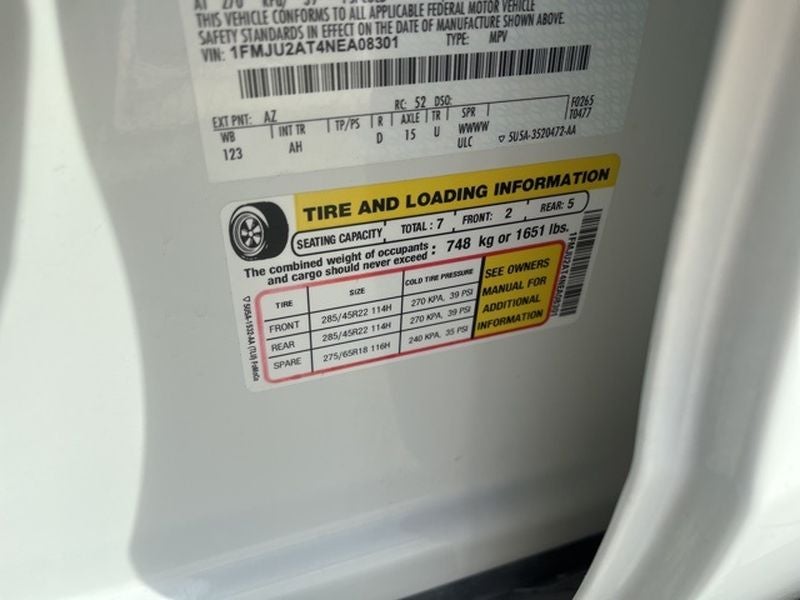 Equipment Group 303A Stealth Package: 1st and 2nd Row Floor Mats with Logo; 3.5L EcoBoost V6 Engine; Panoramic Vista Roof; 7. 450 lbs GVWR; 3.31 Axle Ratio; B&O Sound System by Bang and Olufsen; Power-Folding Sideview Mirrors with Autofold. Ford Co-Pilot360 Assist 2.0: Reverse Brake Assist; 360-Degree Camera with Split View; Active Park Assist 2.0. Stealth Edition Package: Heated/ventilated Leather Front Captain's Chairs; Black Roof Rack Side Rails; LED Taillamp with Black Bezels; Black Headlamp and Fog Lamp Bezels; Ebony Black Power Deployable Running Boards; 22" Premium Black-Painted Aluminum Wheels; Sport-Tuned Suspension; Black Rear Bumper; Ebony Black Twin Spar Grille; Ebony Black Tailgate Applique; P285/45R22 110H AS BSW Tires; Body Color Door Handles. Panoramic Vista Roof. Sport-Tuned Suspension. SYNC 4A with Enhanced Voice Recognition. Star White Metallic TC. Advanced Cargo Manager. Reversible Cargo Mat. **Equipment listed is based on original vehicle build and subject to change. Please confirm the accuracy of the included equip