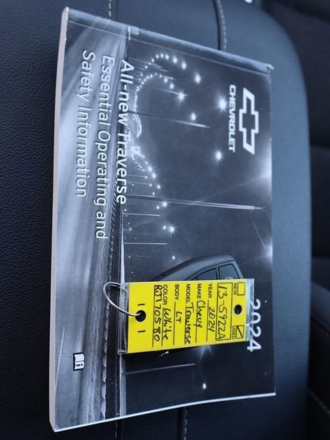 Summit White 2024 Chevrolet Traverse LT 1LT FWD 8-Speed Automatic 2.5L DOHC Midnight/Sport Edition (High Gloss Black Door Upper Molding and Wheels: 20 High Gloss Black Painted Aluminum), Preferred Equipment Group 1LT, 3rd row seats: split-bench, 4-Way Manual Front Passenger Seat Adjuster, 4-Wheel Disc Brakes, 6 Speakers, 6-Speaker Audio System Feature, 8-Way Power Driver Seat Adjuster, ABS brakes, Air Conditioning, Alloy wheels, AM/FM radio: SiriusXM with 360L, Apple CarPlay/Android Auto, Auto High-beam Headlights, Automatic temperature control, Brake assist, Bumpers: body-color, Compass, Delay-off headlights, Driver 4-Way Power Lumbar Seat Adjuster, Driver door bin, Driver vanity mirror, Dual front impact airbags, Dual front side impact airbags, Electronic Stability Control, Emergency communication system, Exterior Parking Camera Rear, Four wheel independent suspension, Front anti-roll bar, Front Bucket Seats, Front Center Armrest, Front dual zone A/C, Front reading lights, Fully automatic headlights, Heated door mirrors, Heated front seats, Heated steering wheel, Illuminated entry, Low tire pressure warning, Navigation System, Occupant sensing airbag, Outside temperature display, Overhead airbag, Overhead console, Panic alarm, Passenger door bin, Passenger vanity mirror, Power door mirrors, Power driver seat, Power Liftgate, Power steering, Power windows, Premium Cloth Seat Trim, Radio data system, Radio: 17.7 Diagonal Display, Rear air conditioning, Rear anti-roll bar, Rear reading lights, Rear window defroster, Rear window wiper, Remote keyless entry, Security system, SiriusXM w/360L, Speed control, Speed-sensing steering, Spoiler, Steering wheel mounted audio controls, Tachometer, TBD Axle Ratio, Telescoping steering wheel, Tilt steering wheel, Traction control, Trip computer, Turn signal indicator mirrors, Variably intermittent wipers, Voltmeter, and Wheels: 18 Grazen Metallic Machined-Face Aluminum.